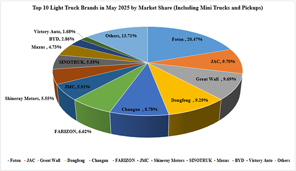 Six manufacturers each sold more than 10,000 units in May. Foton led with 32,800 units sold, capturing 20.47% of the market. JAC and Great Wall Motors followed, each selling 15,500 units. Other top sellers included Dongfeng (14,900 units), Changan (14,100 units), and Farizon, a Geely subsidiary (10,600 units, 6.62% share).