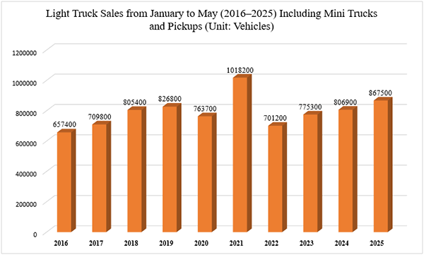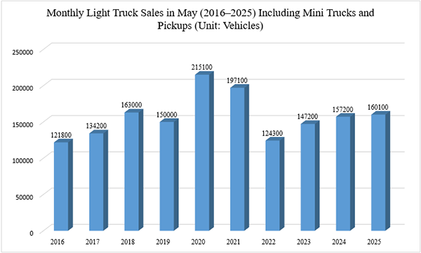 China’s light truck market continued its upward trajectory in May, with sales reaching 160,100 units, a 2% increase year-over-year, according to data released by the China Association of Automobile Manufacturers (CAAM). This marks the fourth straight month of annual growth, despite a broader downturn in the commercial vehicle sector.