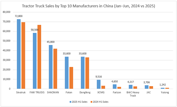 China’s tractor truck market sold more than 270,000 units in the first half of 2025, up 2% from a year earlier, according to data from the China Association of Automobile Manufacturers. While the overall heavy-duty truck market expanded 7% during the same period, tractor truck growth remained more modest, continuing to trail the broader segment.