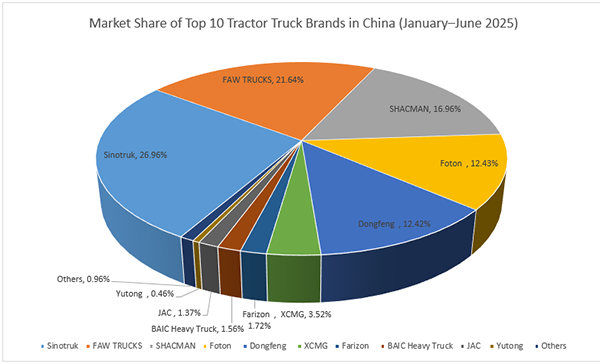 Together, the top 10 companies accounted for 99.04% of total tractor truck sales in the first half of the year. SINOTRUK maintained its leading position with a 26.96% market share, followed by FAW TRUCKS at 21.64%. SHACMAN and Foton held 16.96% and 12.43%, respectively, while Dongfeng rounded out the top five with 12.42%. Collectively, these top five manufacturers controlled over 90% of the market, highlighting their dominant presence.