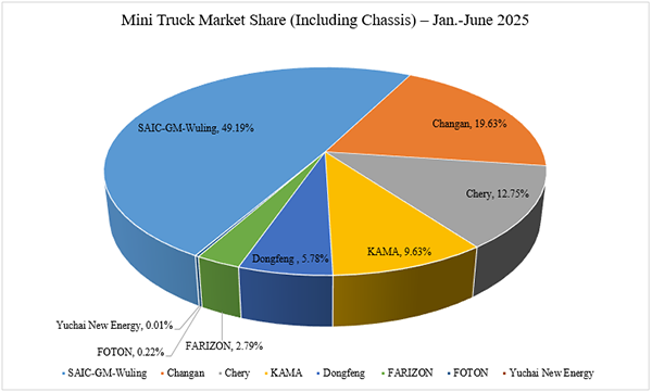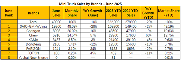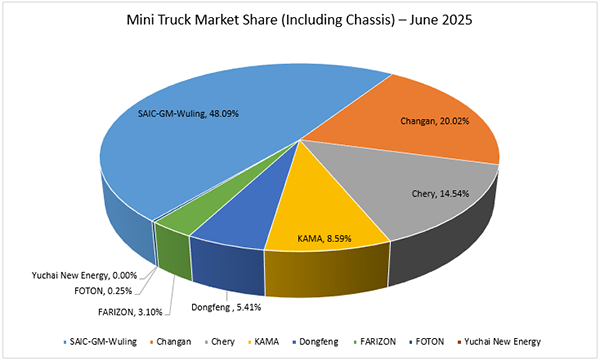 Among the seven companies active in the mini truck market in June, five posted year-over-year gains. Chery led with 57% growth, followed by Foton (45%), Farizon, a Geely brand (34%), Changan (10%), and Kaima (3%). Two unnamed companies recorded double-digit declines, with one down 28%.