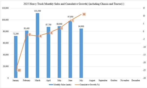 Five automakers sold more than 10,000 heavy trucks in July. Sinotruk led with 22,700 units, followed by FAW TRUCKS (15,900), Dongfeng (13,400), SHACMAN (13,000) and Foton (11,500). Together, the top five commanded over 90% of the market, with Sinotruk alone taking 26.8%. The top ten players accounted for nearly 98% of sales.