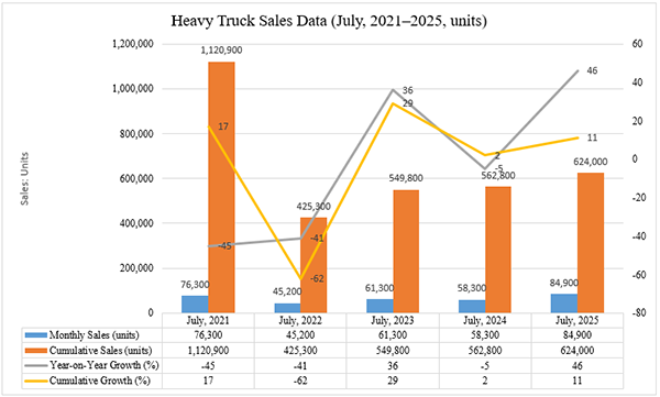 In the first seven months of 2025, heavy truck sales hit 624,000 units, up 11% from a year earlier. That makes it the second-highest level in the past five years. While still far below the record of over 1 million units in 2021, average monthly sales of nearly 90,000 are well above 2023 and 2024 levels, suggesting the market is firmly in recovery. At the current pace, annual sales are on track to top 1 million units again.