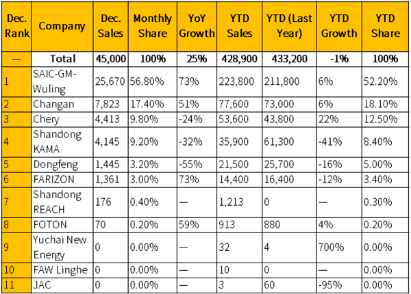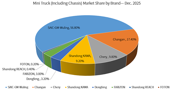 Market share was heavily concentrated. Wuling led the segment with 25,600 units, capturing 56.8% of the December market, followed by Changan with 7,823 units (17.4%). Chery, Shandong Kama, Dongfeng, and FARIZON accounted for 9.8%, 9.2%, 3.2%, and 3.0%, respectively. The top six companies together held 99.5% of the December market.