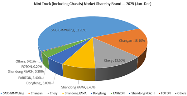 In terms of annual market share, Wuling retained a dominant position with 52.2%, followed by Changan at 18.1% and Chery at 12.5%. Shandong Kama and Dongfeng held 8.4% and 5.0%, with FARIZON at 3.4%. All other companies accounted for less than 0.5% each.