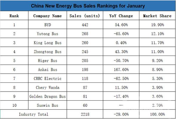In January 2026, 21 key enterprises engaged in new energy bus production and sales sold a total of 2,218 new energy buses, down 29.0% year-on-year.